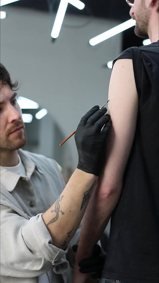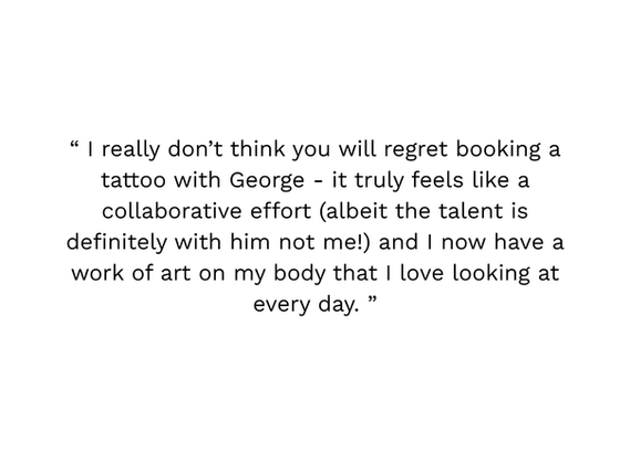 Your tattoos don't need to look like everyone else's. We each have a unique story and deserve better than generic imagery. Each tattoo I create is a bespoke piece of art that we create together, in collaboration. Timeless artwork that you wear on your skin. Creating art is a beautiful experience. The process of transforming vague ideas into artwork is a special journey that I like to walk with you. Witnessing how your personal artwork emerged is important. It adds depth and value to the art you will carry for the rest of your life. As such, I guide you through the creative process, from start to finish. No preparation takes place before our appointment, we create everything together. This begins with a relaxed conversation where we discuss ideas and develop a vision. As we talk, I paint directly onto the skin. This unique approach allows us to clearly visualise how the artwork will flow with the movement of the body. After we have explored ideas and developed a composition that we love, the tattooing may begin.